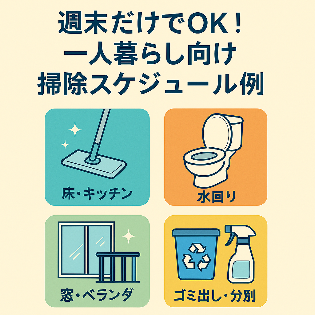 一人暮らしの掃除は、「毎日コツコツ」よりも「週末にまとめて」が断然おすすめ。この記事では、掃除が苦手な人や忙しい人でも実践しやすい、週末限定の掃除スケジュールをご紹介しました。